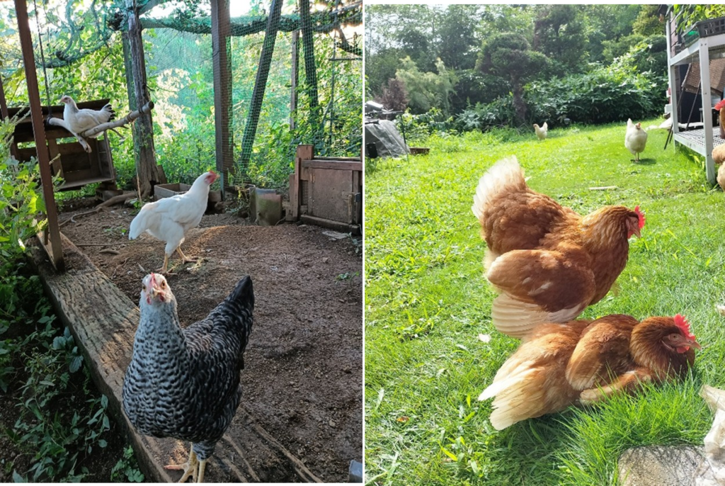 鶏たちはのどかに散策しています。隣の畑の獲れたて